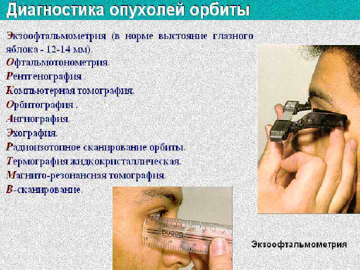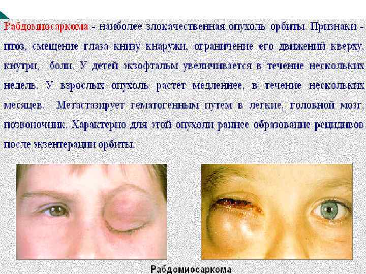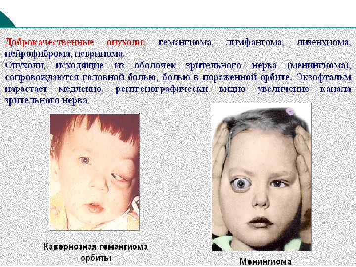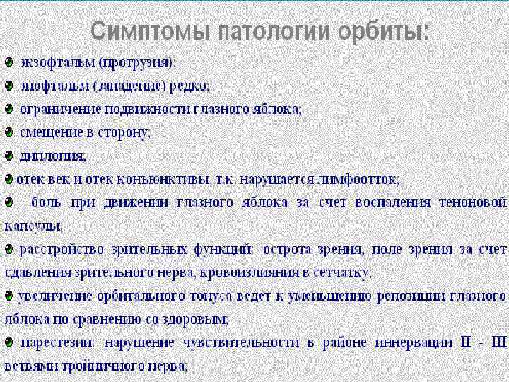 Острые заболевания орбиты: Острые заболевания орбиты развиваются внезапно, характеризуются быстрым нарастанием симптомов: экзофтальма, боли, снижения зрения, диплопии. Процесс чаще всего носит односторонний характер. К заболеваниям орбиты, требующим неотложной терапии, относятся воспалительные процессы, кровоизлияния в ткани орбиты и сосудистая патология.
