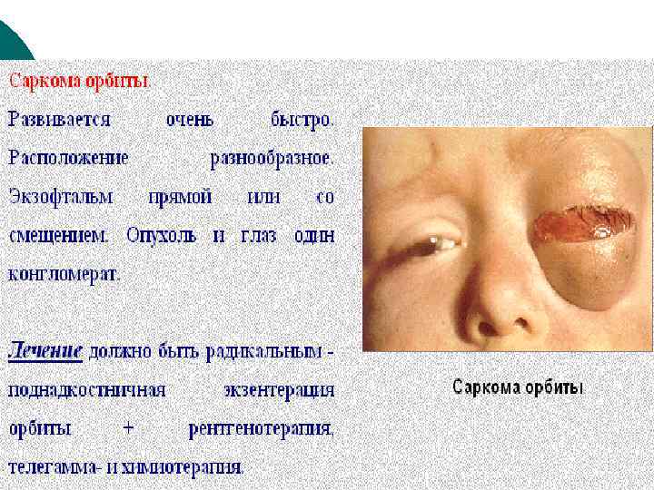 Воспалительные заболевания орбиты: Тенонит – воспал ение теноно вой капсул ы По характеру воспаления – серозный или гнойный. Характерны нерезко выраженный экзофтальм, ограничение подвижности глаза и сильные боли при его движениях, отек века и хемоз конъюнктивы бледно-желтого 1. Антибиотики широкого спектра внутрь или внутримышечно; 2. Сульфаниламиды и салицилаты внутрь. 3. При серозном процессе – кортикостероиды в виде инстилляций, инъекций (под тенонову капсулу или парабульбарно). 4. УВЧ на область глазницы. 5. При нарастании экзофтальма, выраженном гнойном процессе – вскрытие теноновой капсулы между прямыми
