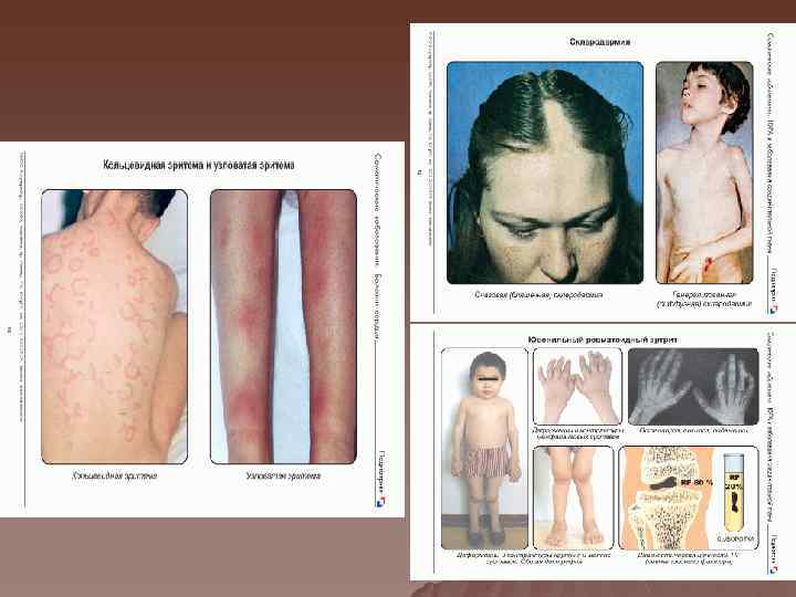 Поражение кожи Анулярная эритема- в виде розовых кольцевидных элементов, иногда зудящих, не возвышающихся над поверхностью кожи и образующих кружевной рисунок. В течение дня кольцевидная эритема может несколько раз исчезнуть и вновь появиться u Ревматические узелки – могут быть различной величины, болезненны, плотные на ощупь, неподвижные. Кожа над ними не изменена, локализуются в области коленных суставов, по ходу сухожилий, исчезает медленно, следов не оставляет. u