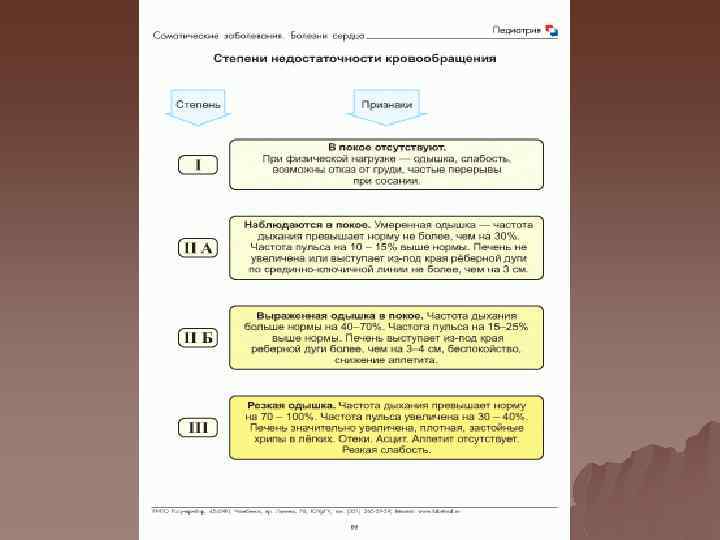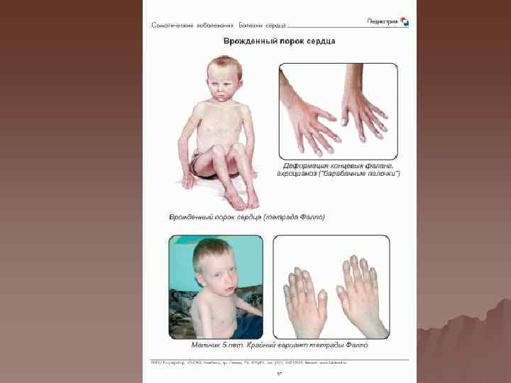 Клиника Фаза адаптации- ребенок после рождения приспосабливается к нарушениям гемодинамики. По мере развития приспособительных механизмов общее состояние улучшается u Фаза относительной компенсации, когда в результате защитных механизмов и/или лекарственных средств состояние сердца и гемодинамики компенсировано u Терминальная фаза –характерно расстройство кровообращения, не поддающееся коррекции при лечении. Оно наступает, когда компенсаторные возможности исчерпаны, развиваются дистрофические и дегенеративные изменения в сердечной мышце u
