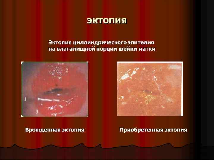 Эктопия шейки матки (псевдоэрозия) n n Смещение цилиндрического эпителия на влагалищную часть шейки матки Выделяют врожденную и приобретенную эктопию