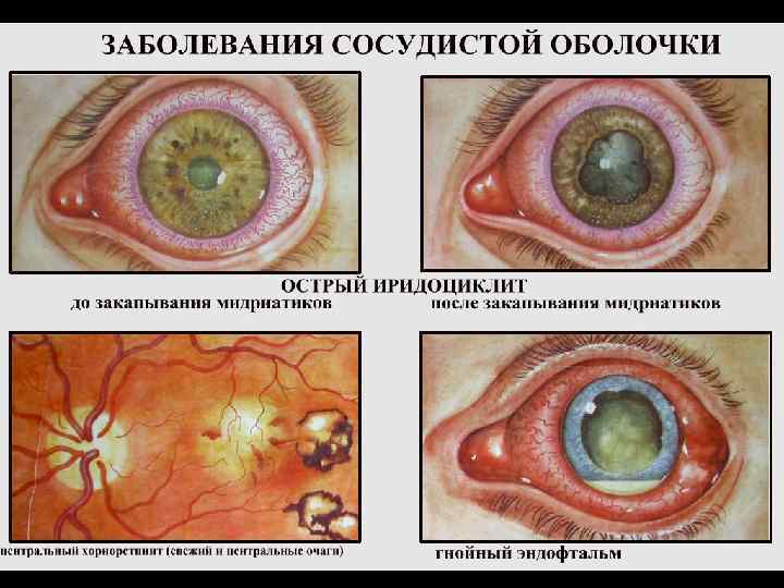 Воспаления сосудистой оболочки 1. Передние увеиты – ириты, иридоциклиты; 2. Задние увеиты – хориоидиты; 3. Панувеит – воспаления всех отделов сосудистой оболочки.