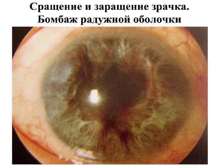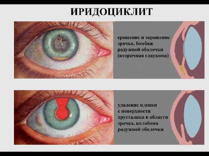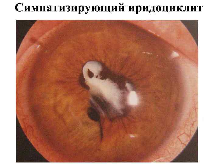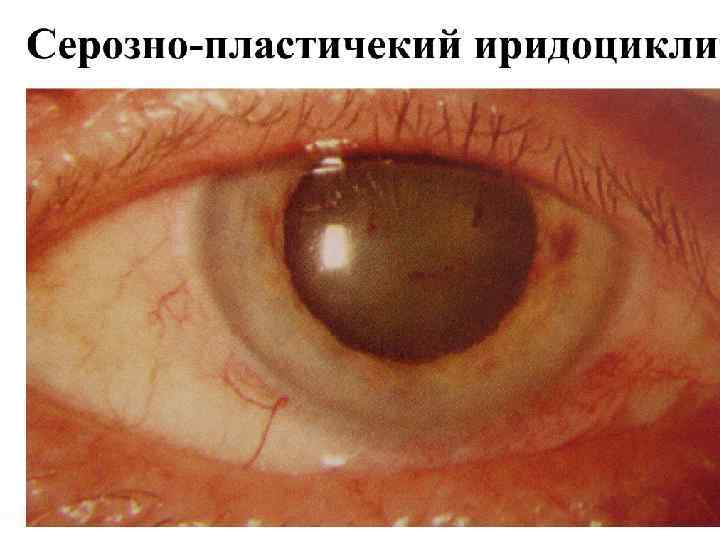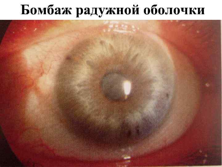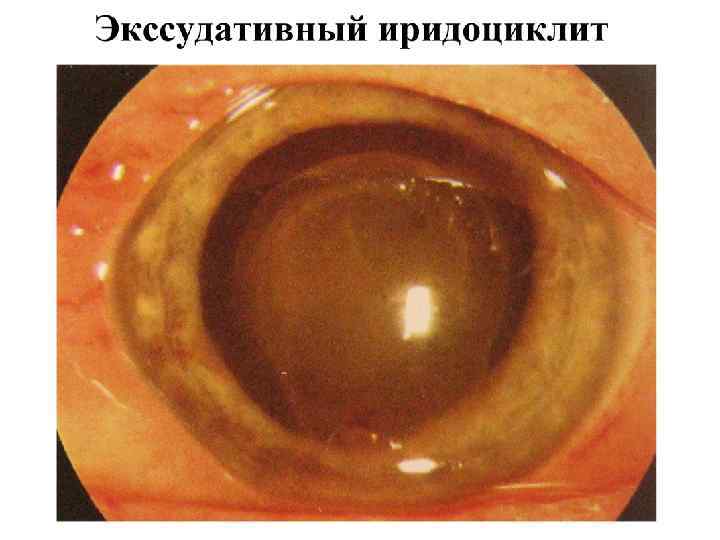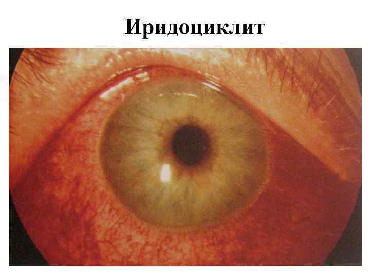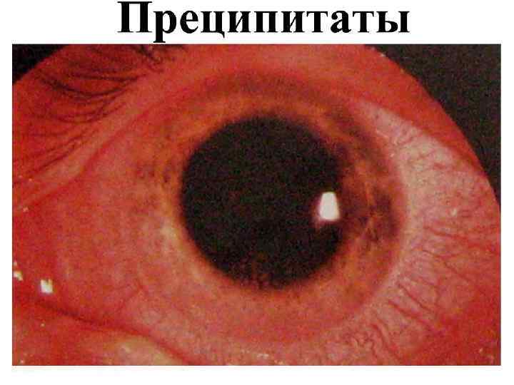 Общая клиническая картина передних увеитов (иридоциклитов) • Жалобы: ноющие боли в глазу, особенно ночью, жжение, болезненность, при пальпации глаза, снижение зрения, у детей до 5 лет боли слабые, снижения зрения нет. • Общие клинические симптомы: – – – – – Перикорнеальная инъекция; Изменение цвета радужки; Сужение зрачка и вялая реакция его на свет; Неправильная форма зрачка (при расширении его) из-за спаек; Помутнение влаги передней камеры; Гипопион, гифема; Преципитаты на задней поверхности роговицы; Снижение ВГД; Seсlusio (сращение) и occlusio (заращение) зрачка – при организации эксудата Бомбаж радужки и вторичная глаукома; – Снижение зрения, зрительный дискомфорт; – Формирование катаракты помутнение стекловидного тела.