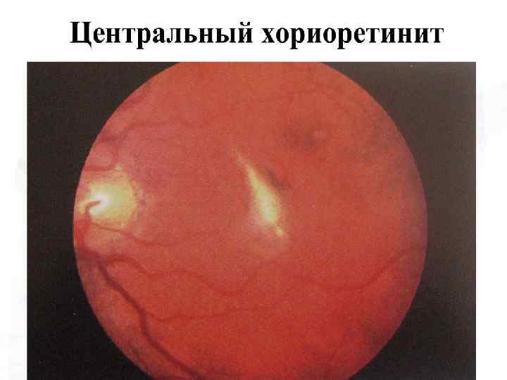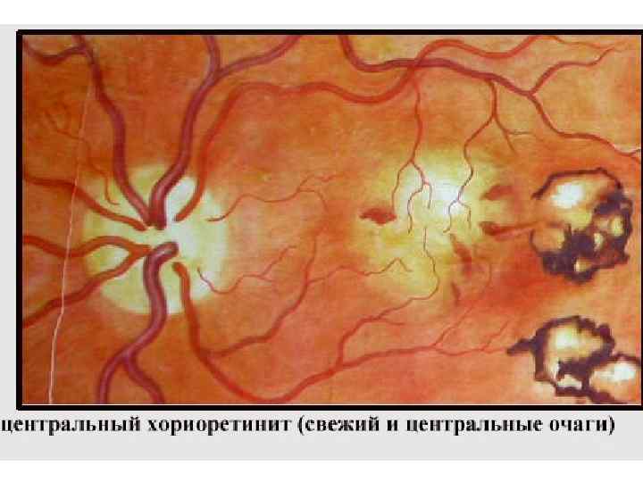 Особенности увеитов различной этиологии • Сифилитический увеит: – Встречается во II-III стадиях сифилиса; – Формы: 1) розеолезная с ограниченной гиперемией; 2) папулезная – сосудистые очажки в радужке; 3) гуммозная – гуммы в цилиарном теле в виде псевдоопухолей; – При врожденном люисе – в виде диссеминтированного хориоретинита с множеством мелких очажков ( «соль с перцем» ); • Токсоплазмозные хориоретиниты: –Врожденные или приобретенные; –В виде крупного желтобелого или беловатокоричневого очага.