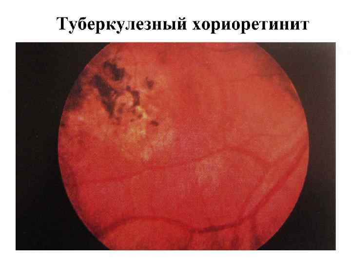 Особенности увеитов различной этиологии (продолжение) II. • Гранулематозные увеиты: Туберкулезный увеит: – – – чаще токсико-аллергический характер; преимущественно у подростков; формы: 1) узелковый иридоциклит с сальными преципитатами; 2) хориоретинит очаговый в виде единичных очагов в папило-макулярной области; 3) хориоретинит диссеминированный с массой очагов по всеми глазному дну;