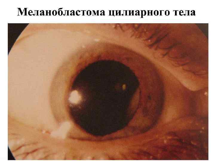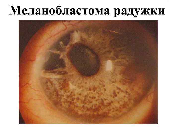 Меланобластома сосудистого тракта (М) Нейроэктодермальная опухоль из клеток шванновых оболочек цилиарных нервов. Встречаются в возрасте старше 10 лет. Поражают обычно один глаз. Меланобластома радужки – коричневый возвышающийся узелок с розовым оттенком. Меланобластома цилиарного тела – темно-бурый узел опухоли прорастает в переднюю камеру тогда и чаще находят; Меланобластома хориоидеи – сероватый округлый участок плюс ткани в любом отделе глазного дна.