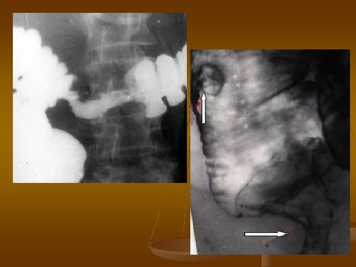 Ирригоскопия n n Дивертикулы выявляются в виде выпячиваний кишечной стенки округлой формы с более или менее выраженной шейкой, которые четко выявляются по наружному или внутреннему контуру кишки, особенно хорошо они видны при двойном контрастировании. У больных с неосложненным дивертикулитом дивертикулы хорошо опорожняются. Задержка контраста - признак дивертикулита.