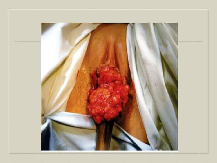 Кондиломы вульвы Папилломавирусная инфекция - ПВИ. Остроконечные кондиломы генитальной области представляют собой бородавчатые разрастания, покрытые многослойным плоским эпителием. ПВИ передается половым путем, проявляется зудом и болевыми ощущениями, встречается в молодом возрасте. Возможна малигнизация элементов.