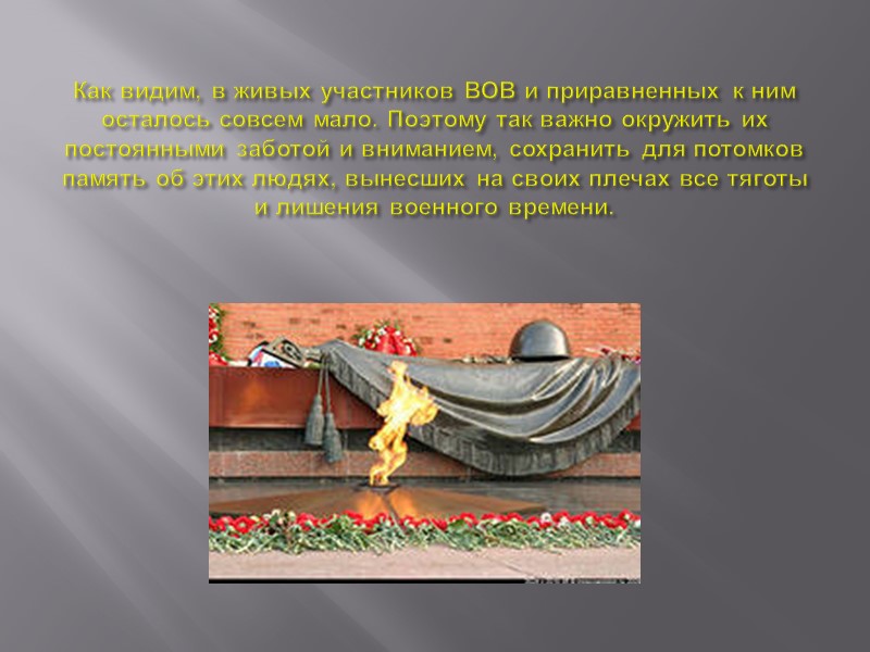 Как видим, в живых участников ВОВ и приравненных к ним осталось совсем мало. Поэтому так важно окружить их постоянными заботой и вниманием, сохранить для потомков память об этих людях, вынесших на своих плечах все тяготы и лишения военного времени.