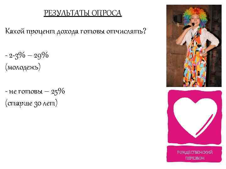 РЕЗУЛЬТАТЫ ОПРОСА Какой процент дохода готовы отчислять? - 2 -3% – 29% (молодежь) - не готовы – 25% (старше 30 лет) РОЖДЕСТВЕНСКИЙ ПЕРЕЗВОН