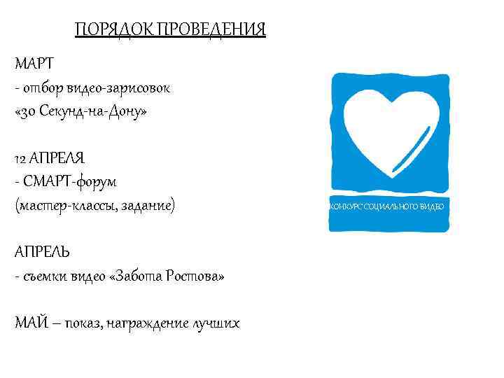 ПОРЯДОК ПРОВЕДЕНИЯ МАРТ - отбор видео-зарисовок « 30 Секунд-на-Дону» 12 АПРЕЛЯ - СМАРТ-форум (мастер-классы, задание) АПРЕЛЬ - съемки видео «Забота Ростова» МАЙ – показ, награждение лучших КОНКУРС СОЦИАЛЬНОГО ВИДЕО