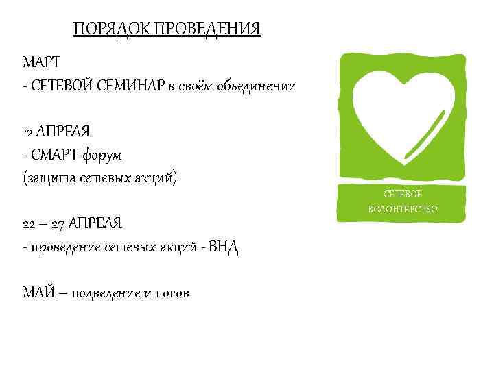 ПОРЯДОК ПРОВЕДЕНИЯ МАРТ - СЕТЕВОЙ СЕМИНАР в своём объединении 12 АПРЕЛЯ - СМАРТ-форум (защита сетевых акций) 22 – 27 АПРЕЛЯ - проведение сетевых акций - ВНД МАЙ – подведение итогов СЕТЕВОЕ ВОЛОНТЕРСТВО