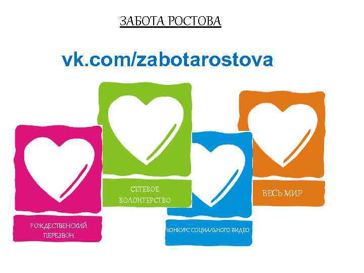 ЗАБОТА РОСТОВА vk. com/zabotarostova СЕТЕВОЕ ВОЛОНТЕРСТВО РОЖДЕСТВЕНСКИЙ ПЕРЕЗВОН КОНКУРС СОЦИАЛЬНОГО ВИДЕО ВЕСЬ МИР