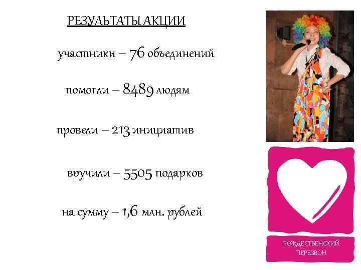 РЕЗУЛЬТАТЫ АКЦИИ участники – 76 объединений помогли – 8489 людям провели – 213 инициатив вручили – 5505 подарков на сумму – 1, 6 млн. рублей РОЖДЕСТВЕНСКИЙ ПЕРЕЗВОН