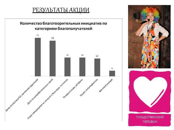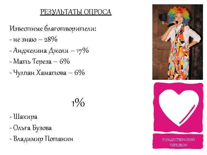 РЕЗУЛЬТАТЫ ОПРОСА Известные благотворители: - не знаю – 28% - Анджелина Джоли – 17% - Мать Тереза – 6% - Чулпан Хаматова – 6% 1% - Шакира - Ольга Бузова - Владимир Потанин РОЖДЕСТВЕНСКИЙ ПЕРЕЗВОН