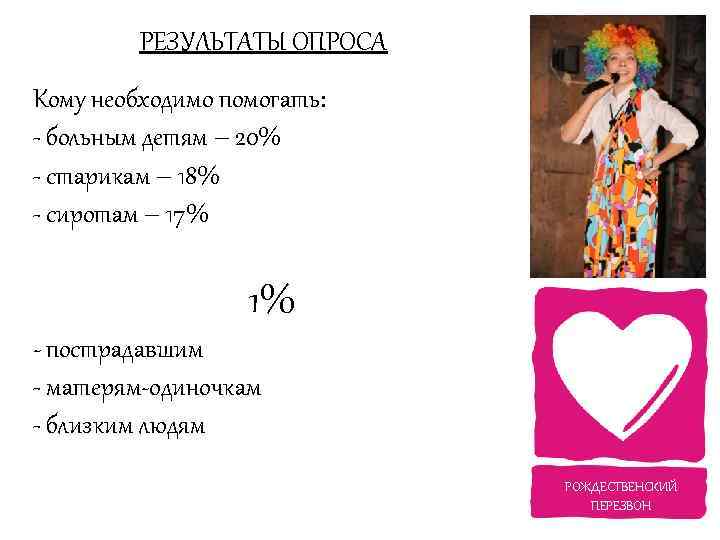 РЕЗУЛЬТАТЫ ОПРОСА Кому необходимо помогать: - больным детям – 20% - старикам – 18% - сиротам – 17% 1% - пострадавшим - матерям-одиночкам - близким людям РОЖДЕСТВЕНСКИЙ ПЕРЕЗВОН