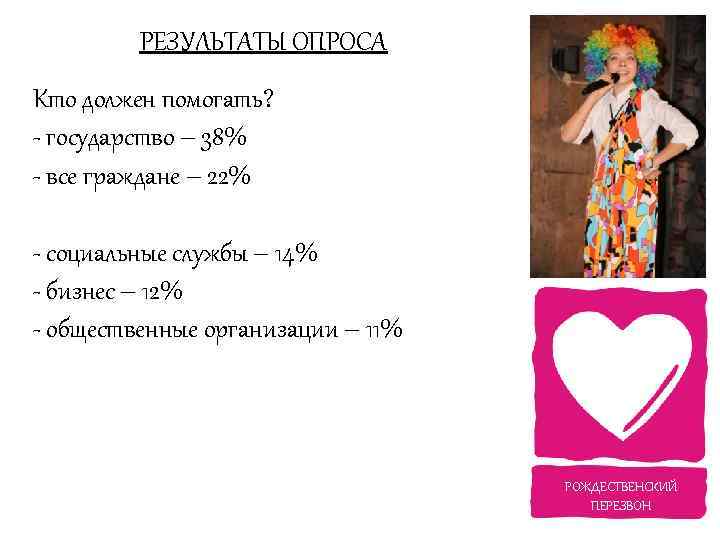 РЕЗУЛЬТАТЫ ОПРОСА Кто должен помогать? - государство – 38% - все граждане – 22% - социальные службы – 14% - бизнес – 12% - общественные организации – 11% РОЖДЕСТВЕНСКИЙ ПЕРЕЗВОН