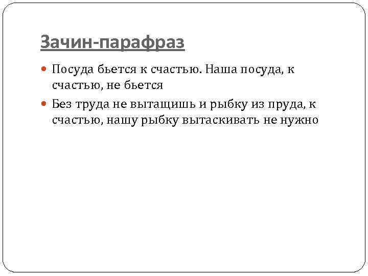 Зачин-парафраз Посуда бьется к счастью. Наша посуда, к счастью, не бьется Без труда не вытащишь и рыбку из пруда, к счастью, нашу рыбку вытаскивать не нужно