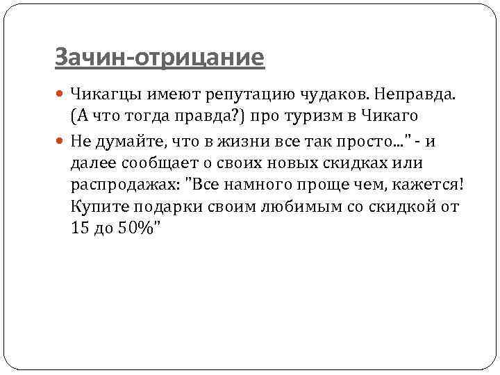 Зачин-отрицание Чикагцы имеют репутацию чудаков. Неправда. (А что тогда правда? ) про туризм в Чикаго Не думайте, что в жизни все так просто. . . " - и далее сообщает о своих новых скидках или распродажах: "Все намного проще чем, кажется! Купите подарки своим любимым со скидкой от 15 до 50%"