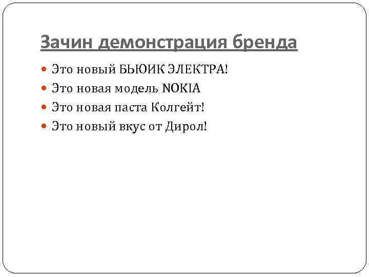 Зачин демонстрация бренда Это новый БЬЮИК ЭЛЕКТРА! Это новая модель NOKIA Это новая паста Колгейт! Это новый вкус от Дирол!