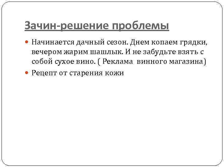 Зачин-решение проблемы Начинается дачный сезон. Днем копаем грядки, вечером жарим шашлык. И не забудьте взять с собой сухое вино. ( Реклама винного магазина) Рецепт от старения кожи