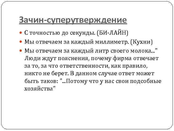 Зачин-суперутверждение С точностью до секунды. (БИ-ЛАЙН) Мы отвечаем за каждый миллиметр. (Кухни) Мы отвечаем за каждый литр своего молока. . . " Люди ждут пояснения, почему фирма отвечает за то, за что ответственности, как правило, никто не берет. В данном случае ответ может быть таков: ". . . Потому что у нас свои подсобные хозяйства"