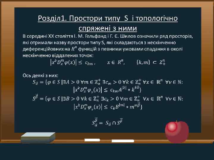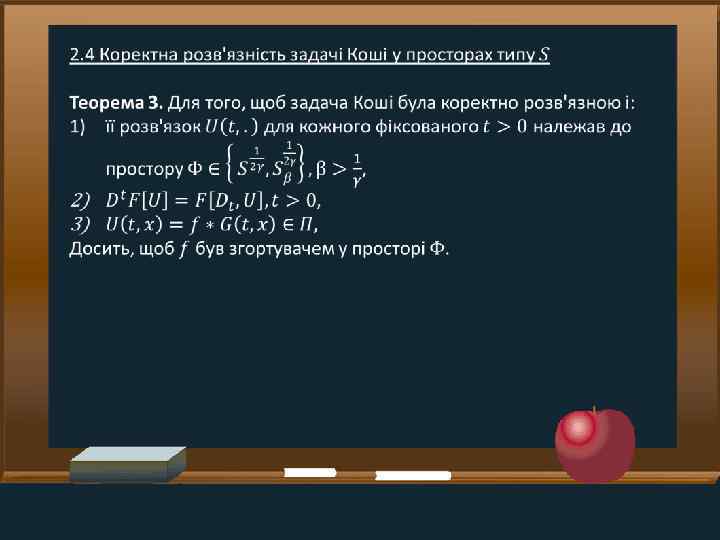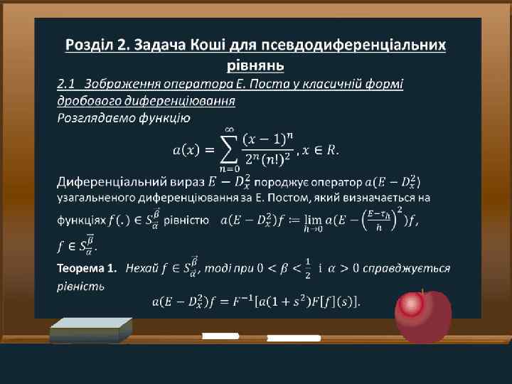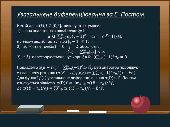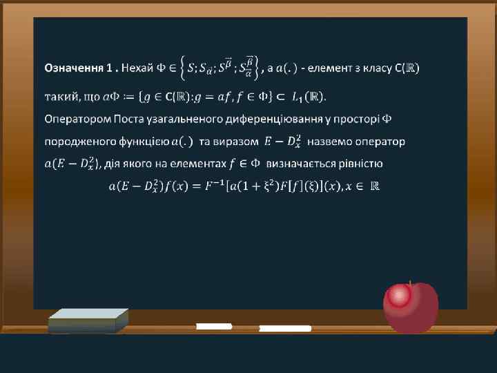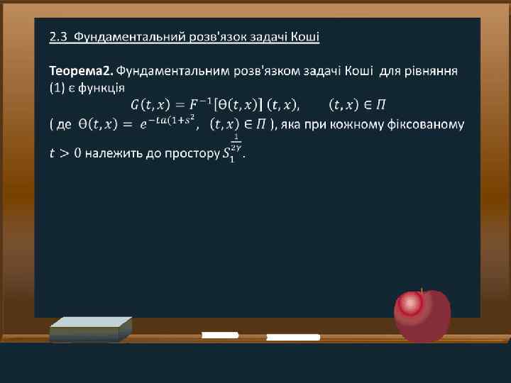 Задачі • Ознайомитись із класичними підходами до розширення поняття інтегро-диференціювання • Дослідити питання про можливість розширення оператора Е. Поста узагальненого диференціювання на ширші класи функцій та відшукати форму дії цього оператора, яка була б зручною для розв'язування задач Коші для ПДР із таким оператором класичними засоби теорії параболічних рівнянь із частинними похідними • Установити коректну розв'язність задачі Коші у просторах типу S для одного класу параболічних ПДР із оператором Е. Поста, які мають структуру, подібну до класичного рівняння теплопровідності
