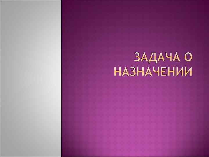 Задача о назначениях - частный случай транспортной задачи, в которой количество пунктов производства и потребления равны, т. е транспортная таблица имеет форму квадрата, а объем потребления и производства в каждом пункте равен 1. Методы решения Симплексный метод Метод потенциалов Венгерский алгоритм