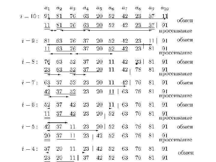 2) Асимметрия метода: один неправильно расположенный «пузырек» на «тяжелом» конце почти отсортированного массива «всплывет» на место за один проход: Неправильно расположенный «камень» на «легком» конце будет «опускаться» на правильное место только по одному шажку на каждом проходе:
