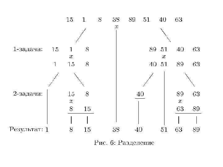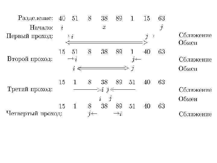 Процесс разделения: i = l; j = r; Цикл пока ai < х цикл /* проверка i < r не нужна: х где-то есть */ i : = i + 1; /* в конце ai х */ конец цикла; пока х < aj цикл /* проверка j > i не нужна: х есть */ j : = j – 1; /* в конце aj х */ конец цикла; если i ≤ j то /* если i = j, a[i = j] = x, нужен сдвиг индексов для выхода из цикла */ обменять ai и aj /* теперь ai х aj */ i : = i + 1; /*на случай ai = х : добавить в левую часть */ j : = j – 1; /* на случай aj = х : добавить в правую часть */ пока i < j