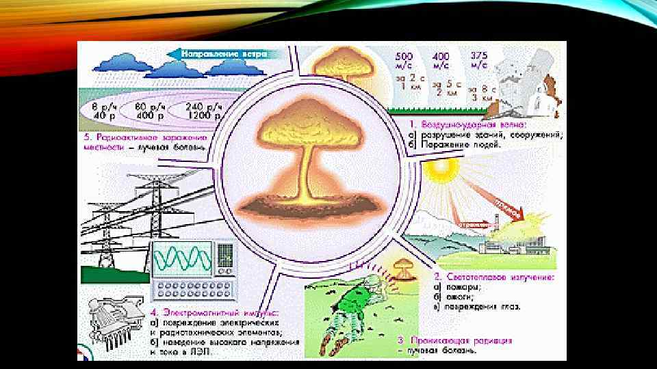 ПОРАЖАЮЩИЕ ФАКТОРЫ ЯДЕРНОГО ВЗРЫВА • Ядерный взрыв способен мгновенно уничтожить или вывести из строя незащищенных людей, открыто стоящую технику, сооружения и различные материальные средства. Основными поражающими факторами ядерного взрыва (ПФЯВ) являются: • ударная волна; • световое излучение; • проникающая радиация; • радиоактивное заражение местности; • электромагнитный импульс (ЭМИ).