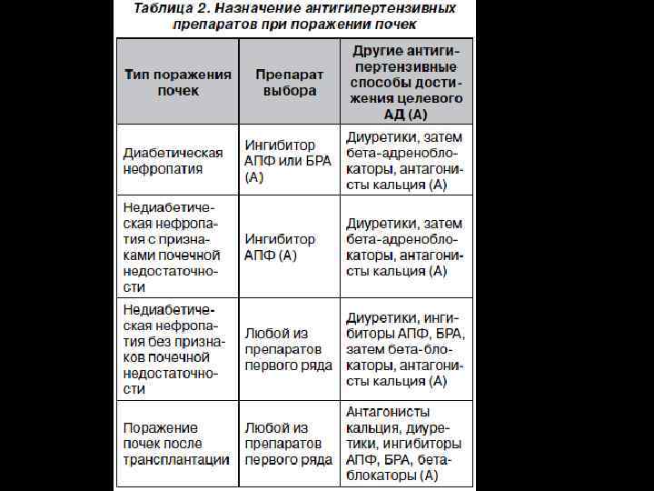 Рекомендации по ведению больных с АГ Рекомендация 8: У пациентов с ХБП и АГ в возрасте >=18 лет антигипертензивная терапия должна включать: ИАПФ или БРА с целью улучшения почечных исходов.