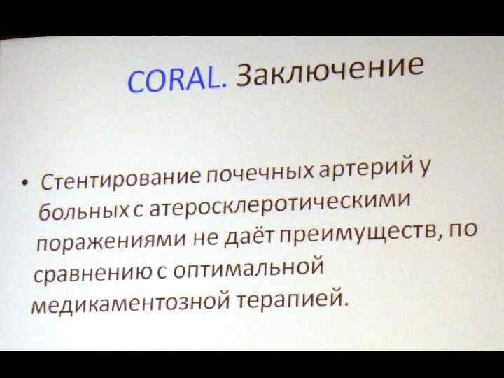 Сравнительная эффективность реваскуляризации почки и лекарственной терапии при атеросклеротическом стенозе почечной артерии Реваскуляризация почек у больных с атеросклеротическим стенозом почечных артерий сопровождается достаточно большой частотой осложнений при отсутствии преимуществ перед изолированной лекарственной терапией. The ASTRAL Investigators. Revascularization versus Medical Therapy for Renal-Artery Stenosis. N Engl J Med 2009; 361: 1953 -1962
