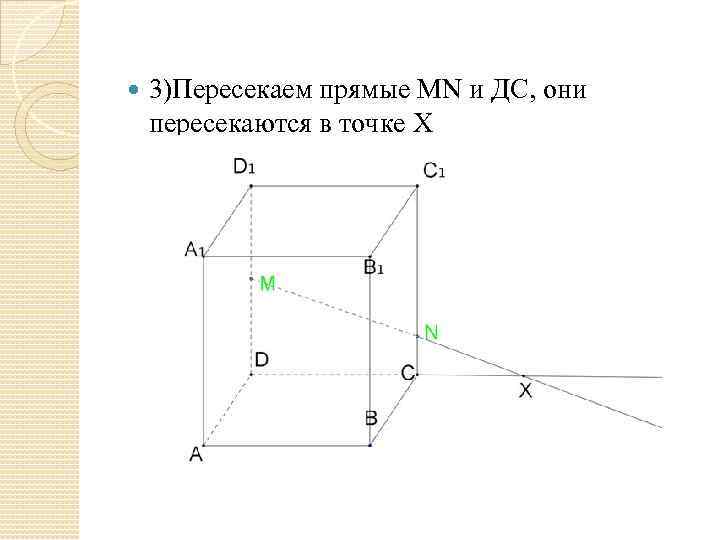 3)Пересекаем прямые МN и ДC, они пересекаются в точке X