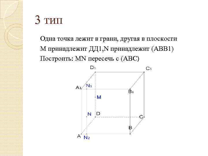 3 тип Одна точка лежит в грани, другая в плоскости М принадлежит ДД 1, N принадлежит (АВВ 1) Построить: МN пересечь с (АВС)