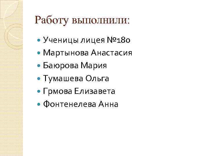 Работу выполнили: Ученицы лицея № 180 Мартынова Анастасия Баюрова Мария Тумашева Ольга Грмова Елизавета Фонтенелева Анна