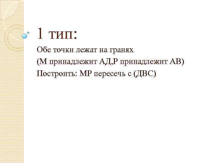 1 тип: Обе точки лежат на гранях (М принадлежит АД, Р принадлежит АВ) Построить: МР пересечь с (ДВС)