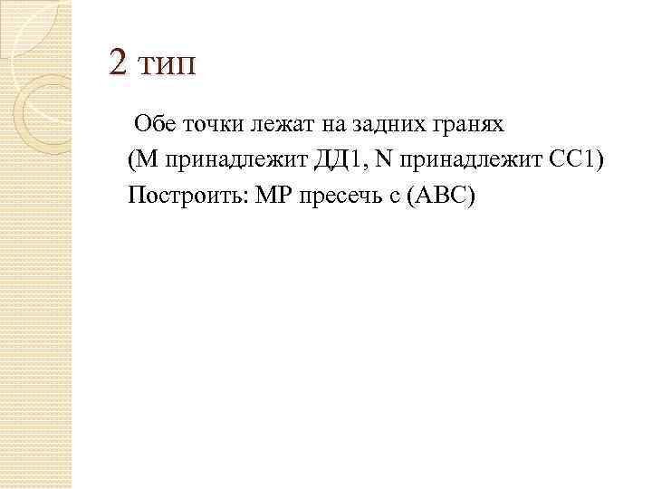 2 тип Обе точки лежат на задних гранях (М принадлежит ДД 1, N принадлежит СС 1) Построить: МР пресечь с (АВС)