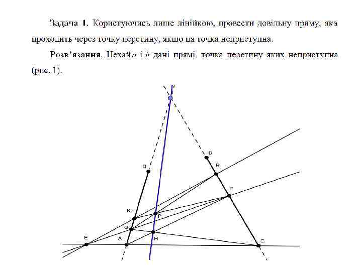 За допомого конфігураційних теорем, застосовуючи тільки лінійку, можна розв’язувати задачі з неприступними елементами, що дуже важливо наприклад для геодезії. Геодезія (у перекладі з грецької - «землерозділення» ) - наука про методи визначення фігури і розмірів Землі, зображення земної поверхні на планах і картах та точних вимірювань на місцевості, пов'язаних з розв'язанням різних наукових і практичних завдань. Щоб наблизити наші побудови до практики, будемо розглядати їх на плані даної місцевості. Потім розглядатимемо лише той випадок, в якому неприступна точка знаходиться поза планом. Якщо неприступна точка потрапила на план, то розв’язати задачу можна на плані, а потім перенести отриманий розв’язок на місцевість.
