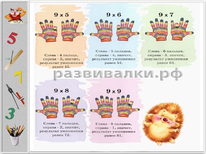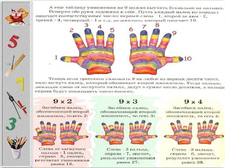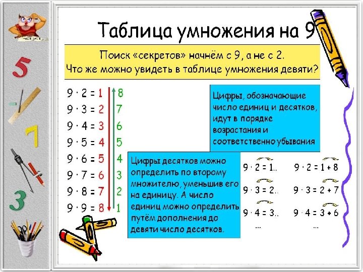 Логика — лучший помощник памяти Запомнить таблицу умножения на 3, как и считать тройками, тоже обычно не составляет труда. А для умножение на 4 есть подсказка: это все равно, что умножение на 2, выполненное дважды. Эти и последующие действия требуют мобилизации логики. Запомнить умножение на 5 можно следующими способами. Во-первых, очень удобно умножать на 5 способом деления пополам результата умножения на 10. Иными словами, сначала увеличиваем число в 10 раз, а затем делим его пополам. Во-вторых, есть такой способ: если число чётное, приписываем 0 к половине числа. Если число нечётное, приписываем 5 к половине предыдущего числа. Например, чтобы умножить 6 на 5, приписываем 0 к половине от 6. Чтобы умножить 9 на 5, приписываем 5 к половине от 8. После того, как таблица умножения на 5 усвоена, осталось запомнить всего десяток уникальных примеров. Полезной будет подсказка, помогающая запомнить умножение на 9: сначала число умножаем на 10, а затем его отнимаем, например: 7 х 9 = 7 х 10 — 7 = 63