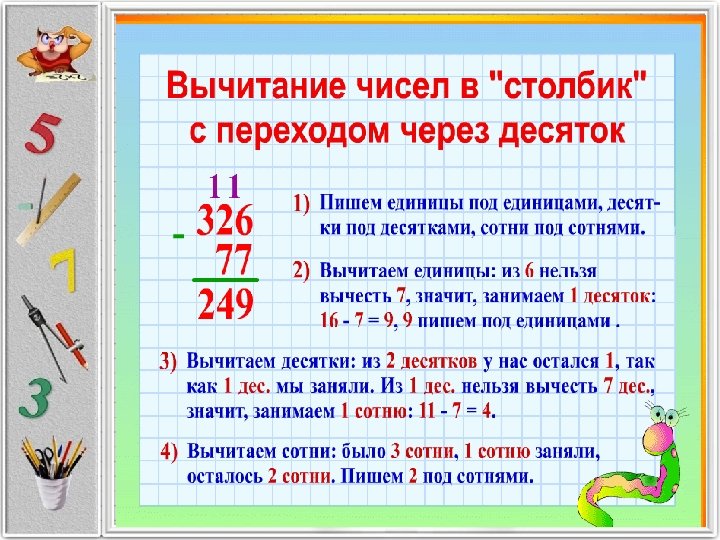 Алгоритм. 1. Записываю числа в столбик: единицы под единицами, десятки под десятками, сотни под сотнями. 2. Вычитаю единицы… 3. Вычитаю десятки… 4. Вычитаю сотни… 5. Читаю результат.