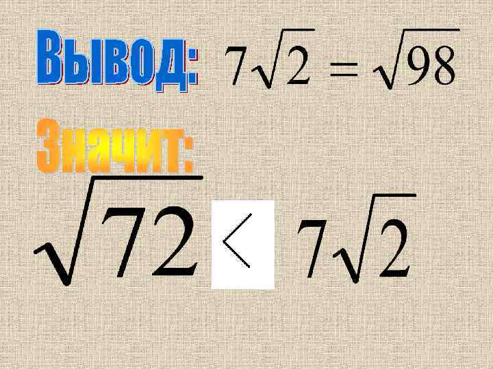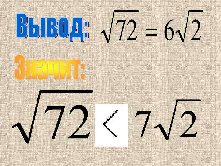 В чем отличие выражений? • Вынесение множителя из под знака корня • = Внесение множителя под знак корня Кв. корень из числа или корень из произведения Множитель перед кв. корнем