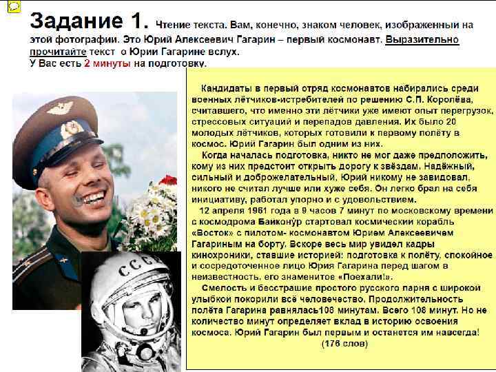 Задание № 2 Полёт Юрия Гагарина по околоземной орбите стал возможен благодаря усилиям Cергея Павловича Королёва – выдающегося конструктора и учёного, работавшего в области ракетной и ракетно-космической техники. Именно он создал первый пилотируемый космический корабль "Восток-1", доставивший Гагарина на орбиту. Перескажите прочитанный Вами текст, включив в пересказ слова С. П. Королёва о Юрии Гагарине: «Он открыл людям Земли дорогу в неизвестный мир. Но только ли это? Думается, Гагарин сделал нечто большее – он дал людям веру в их собственные силы, в их возможности, дал силу идти увереннее, смелее…» Подумайте, где лучше использовать слова С. П. Королёва в пересказе. У Вас есть одна минута на подготовку. Вы можете использовать любые способы цитирования.