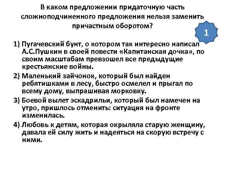 В каком предложении придаточную часть сложноподчиненного предложения нельзя заменить причастным оборотом? 1 1) Пугачевский бунт, о котором так интересно написал А. С. Пушкин в своей повести «Капитанская дочка» , по своим масштабам превзошел все предыдущие крестьянские войны. 2) Маленький зайчонок, который был найден ребятишками в лесу, быстро осмелел и прыгал по всему дому, выпрашивая морковку. 3) Боевой вылет эскадрильи, который был намечен на утро, пришлось отменить: ситуация на фронте изменилась. 4) Любовь к детям, которая окрыляла старую женщину, давала ей силу жить и надеяться на скорую встречу с ними.