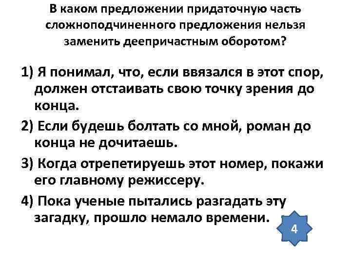 В каком предложении придаточную часть сложноподчиненного предложения нельзя заменить деепричастным оборотом? 1) Я понимал, что, если ввязался в этот спор, должен отстаивать свою точку зрения до конца. 2) Если будешь болтать со мной, роман до конца не дочитаешь. 3) Когда отрепетируешь этот номер, покажи его главному режиссеру. 4) Пока ученые пытались разгадать эту загадку, прошло немало времени. 4