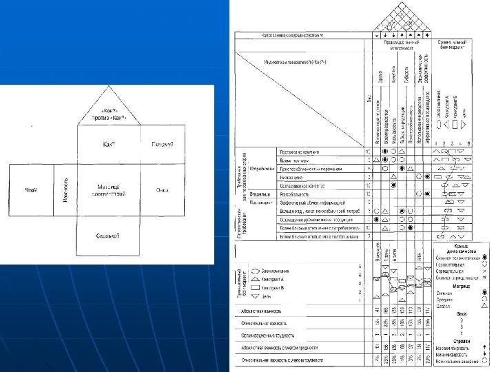 Эта особенность реализуется путем построения специальной таблицы, которая имеет форму дома - «дом качества» . Здесь накапливаются результаты исследования. Они используются для совершенствования бизнес-процесса. В областях «дома» размещают исследуемые элементы. Для Что? и Как? Для «крыши» Как? и Как?