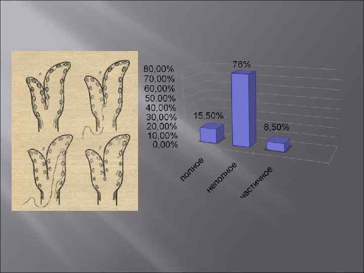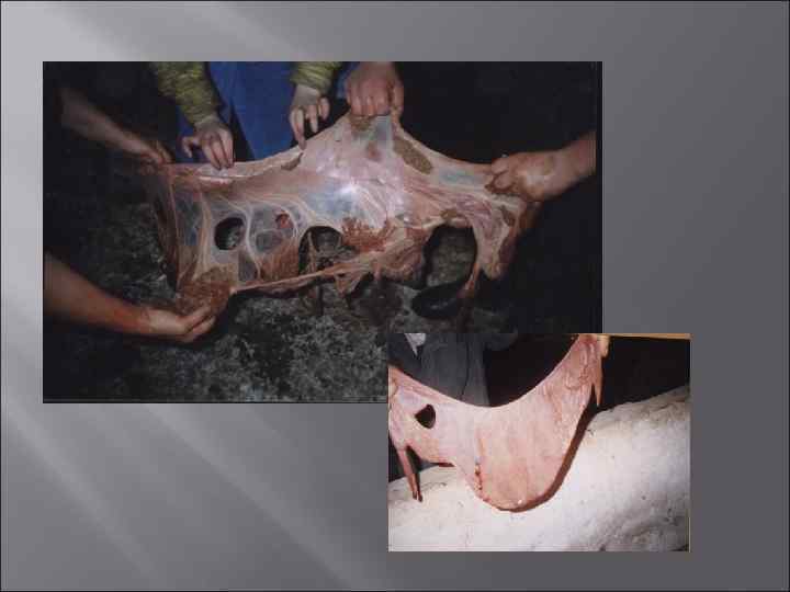 Задержание последа бывает: полное, неполное, частичное. v Полное - хорион сохраняет связь с карункулами обоих рогов матки. v Неполное – хорион прикреплен к карункулам рога – плодовместилища и выделился из свободного рога. v Частичное – хорион сохраняет связь с некоторыми карункулами.