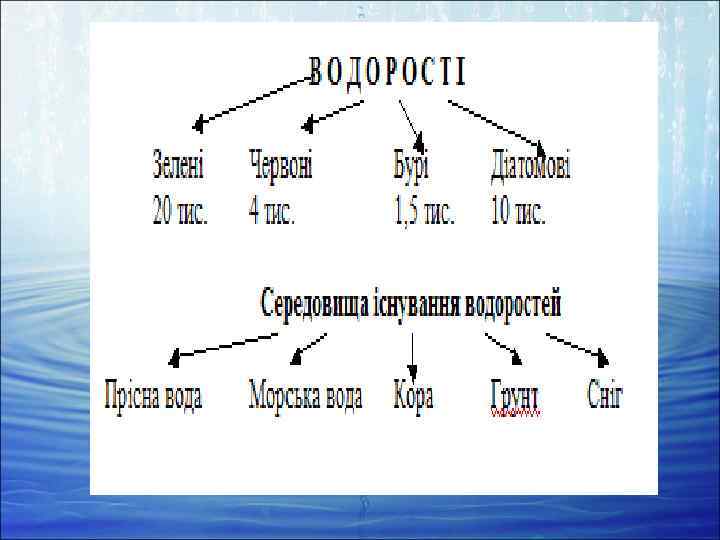 Водорості об'єднують у різні відділи. Ми розглянемо представників відділів Зелені, Діатомові, Бурі та Червоні водорості. Терміни і поняття, які потрібно засвоїти слань, симбіоз, мутуалізм