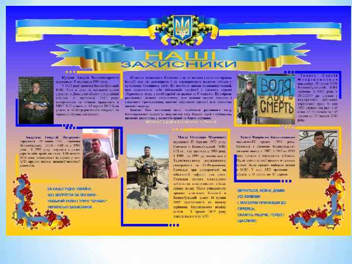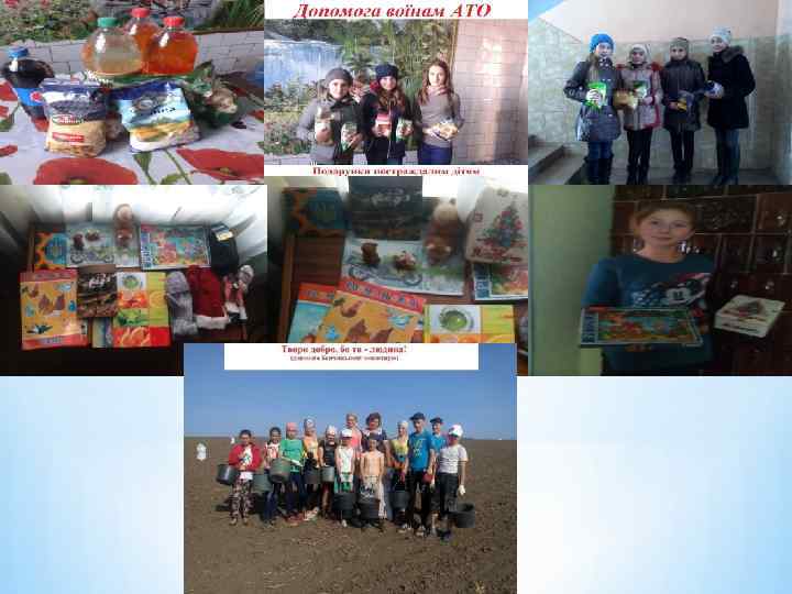 ета: Тип проекту: практико-орієнтований. За змістом: надпредметний. За кількістю учасників: масовий. Тривалість: 2015 -2016 роки Учасники – 11 клас Керівник – Герман В. Д. розширити знання учнів про нашу Батьківщину – Україну; виховувати в учнів любов до України, патріотизм, повагу до її захисників - учасників АТО довести до свідомості учнів, що ми самі відповідаємо за долю нашої держави, що кожен українець повинен мати активну громадянську позицію щодо подій на сході України. Очікувані результати: вихований свідомий громадянин-патріот України, який усвідомлює свою належність до сучасної цивілізації, який підготовлений до життя і чітко орієнтується в сучасних реаліях. Організація тематичних фотовиставок, присвячених визначним подіям в історії українського народу