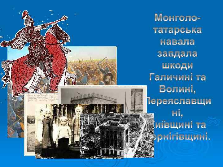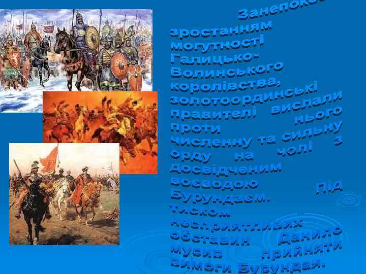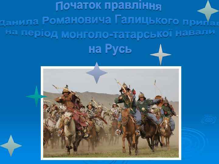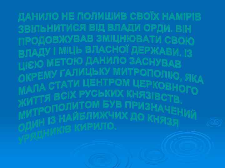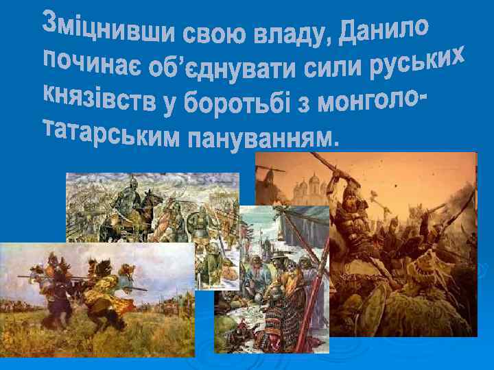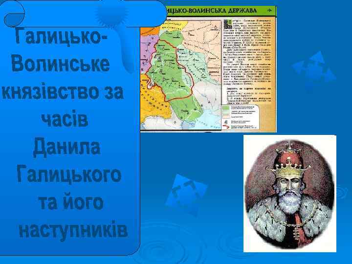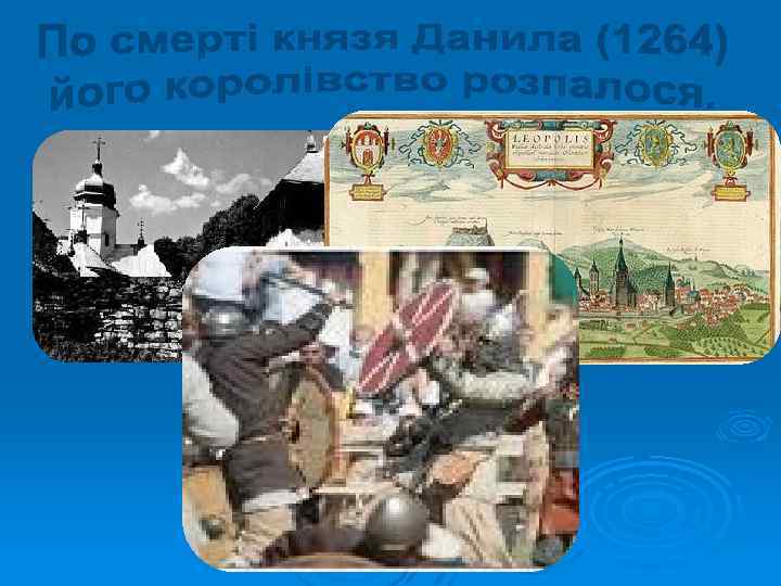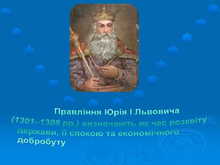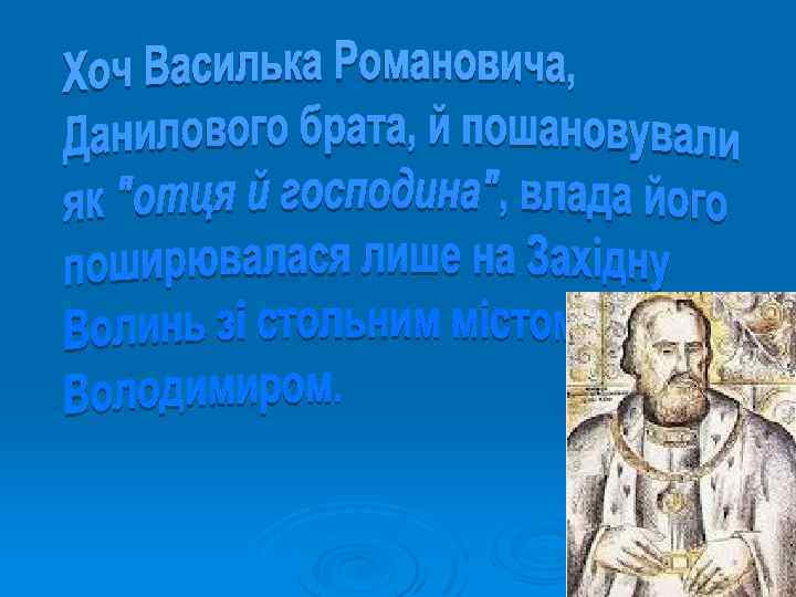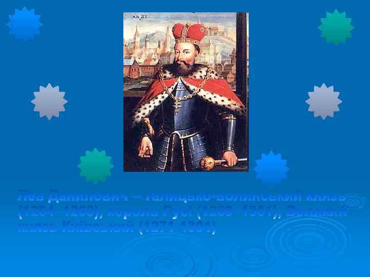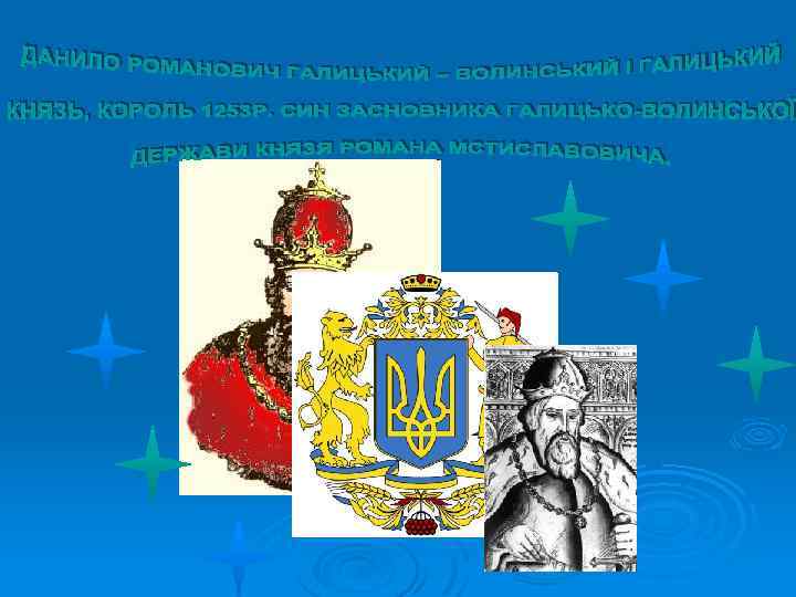 Галицьке князівство Волинське князівство Роман Мстиславович (1195) Данило (1238) Василько (1270) Лев (1301) Володимир (1270) Юрій (1301) Мстислав (1292) Андрій і Лев ІІ (1323) Юрій ІІ Болеслав (1325)